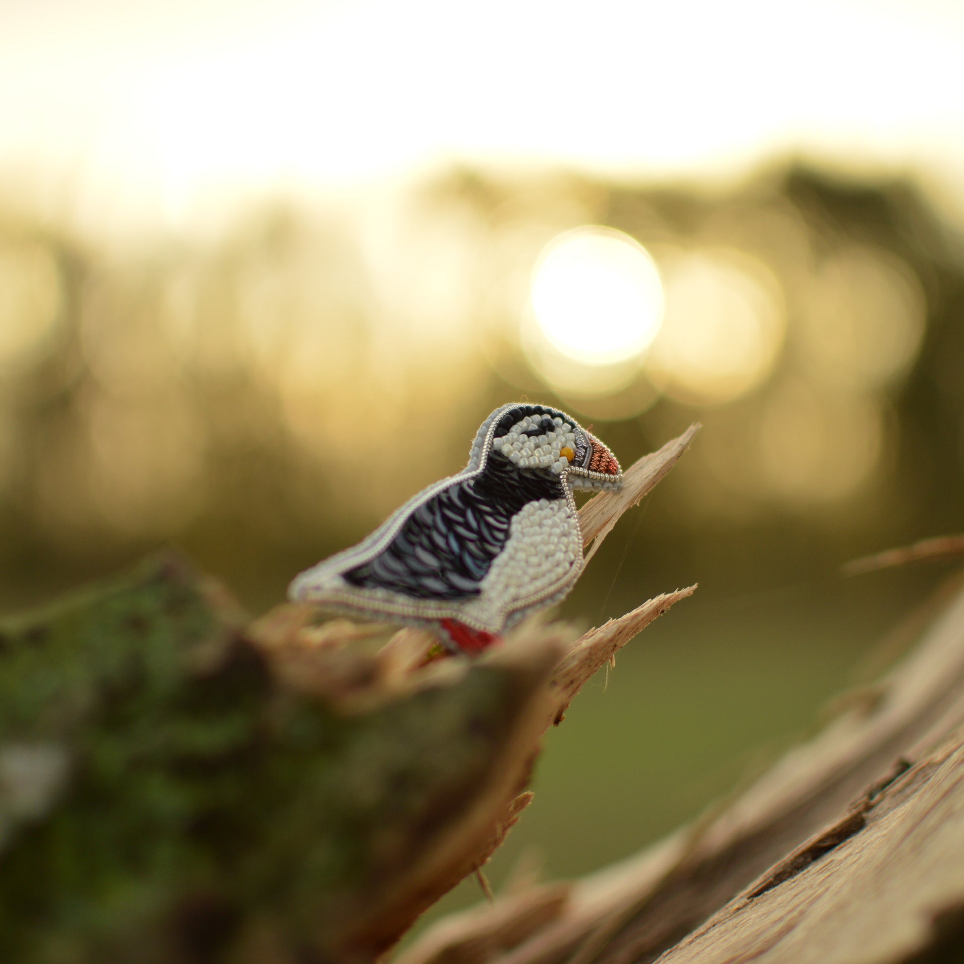 Embellished with an array of beads and French sequins, this delightful brooch brings a playful touch to your outfit. Backed with patterned faux suede, it measures approx 5x3 cm and is a must-have accessory for puffin enthusiasts.