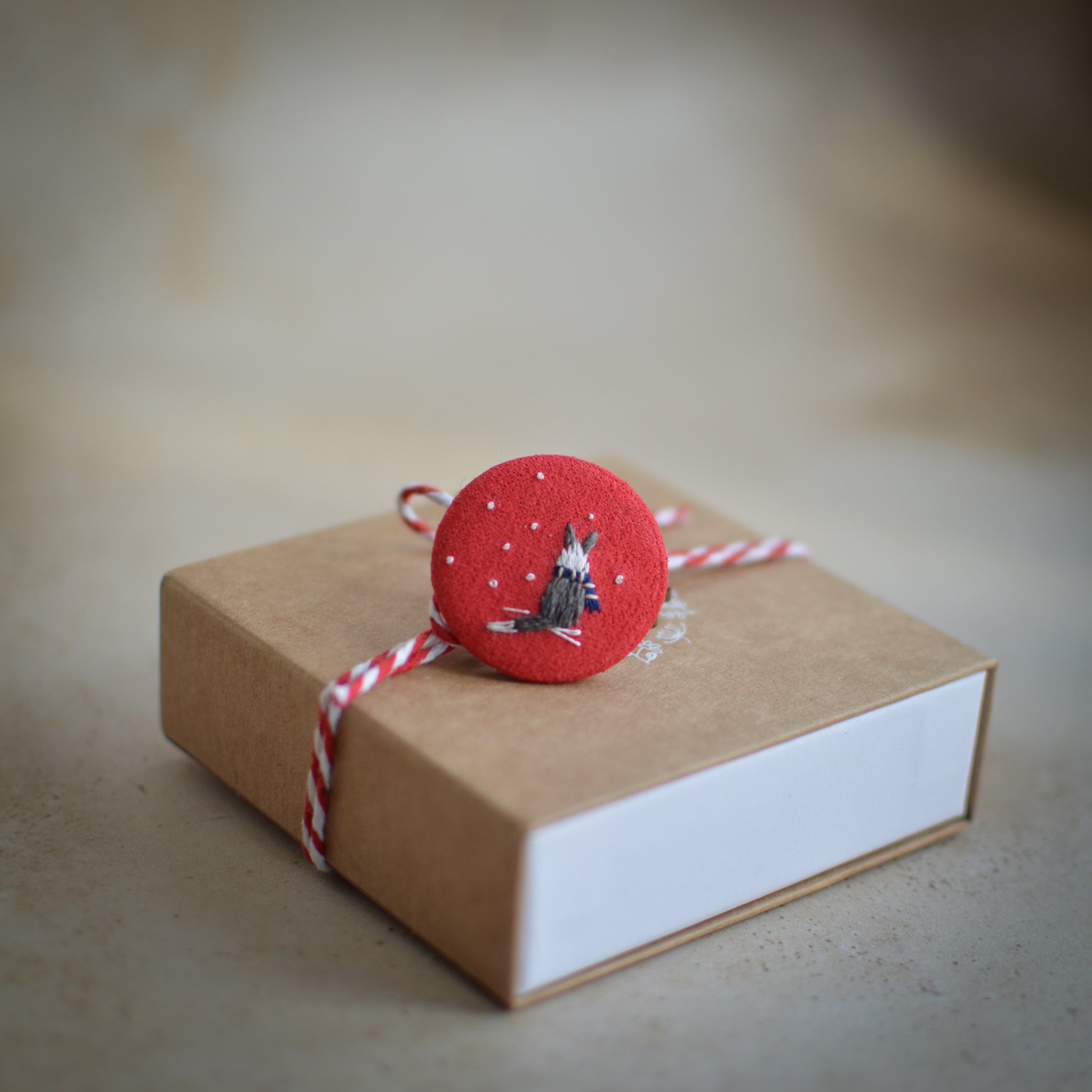 Hand-embroidered on red faux suede