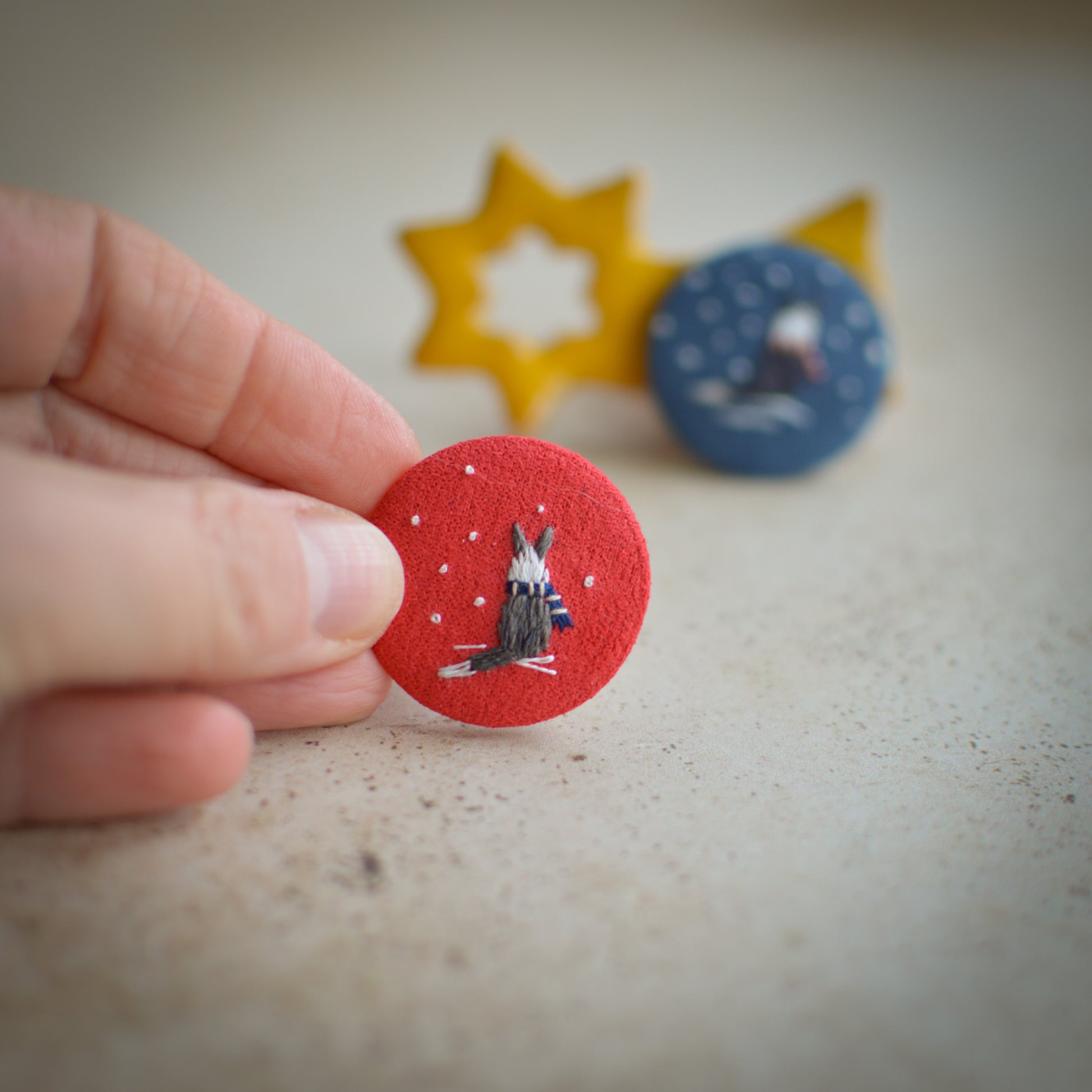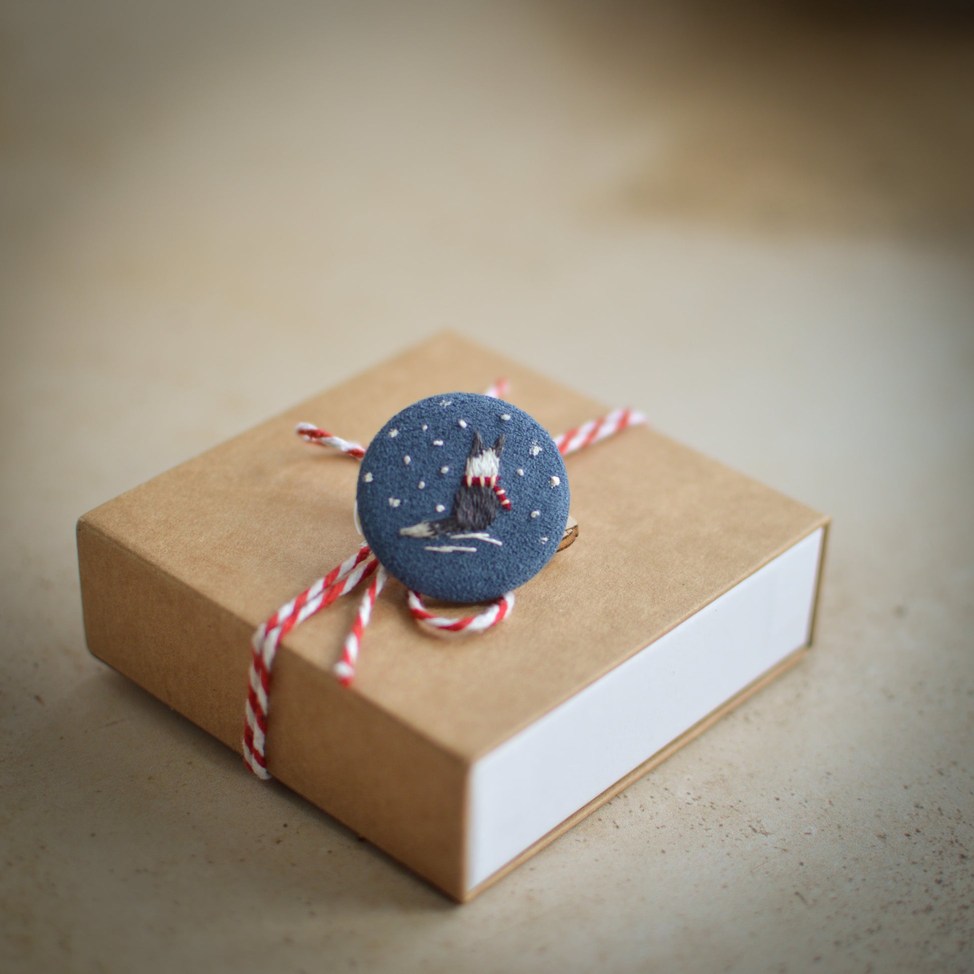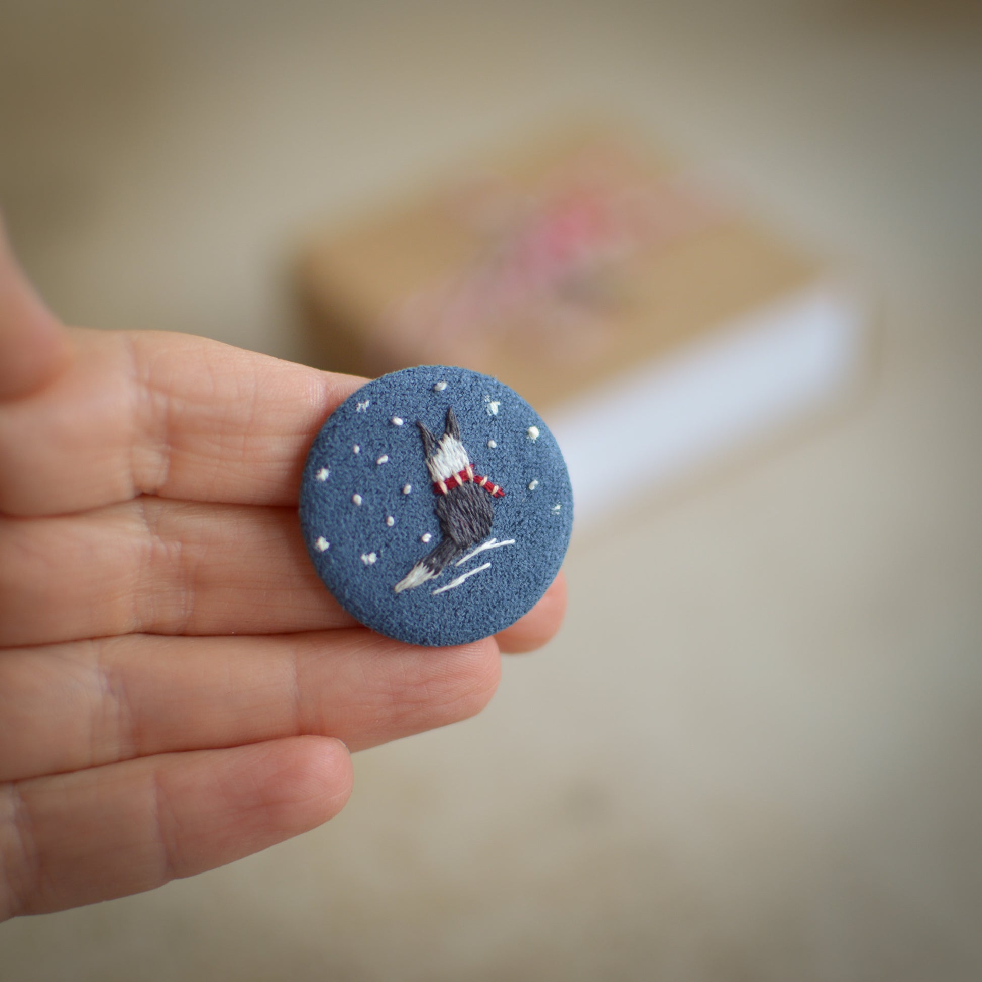This handmade embroidered badge features a wintery Border Collie on faux suede, detailed with tiny stitches and delicate snowflakes. Thoughtfully crafted in a small 3 cm size, it adds a warm holiday touch to any outfit.