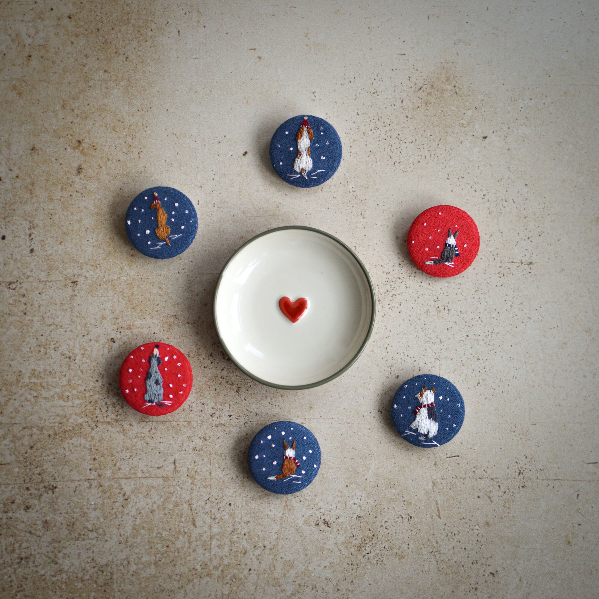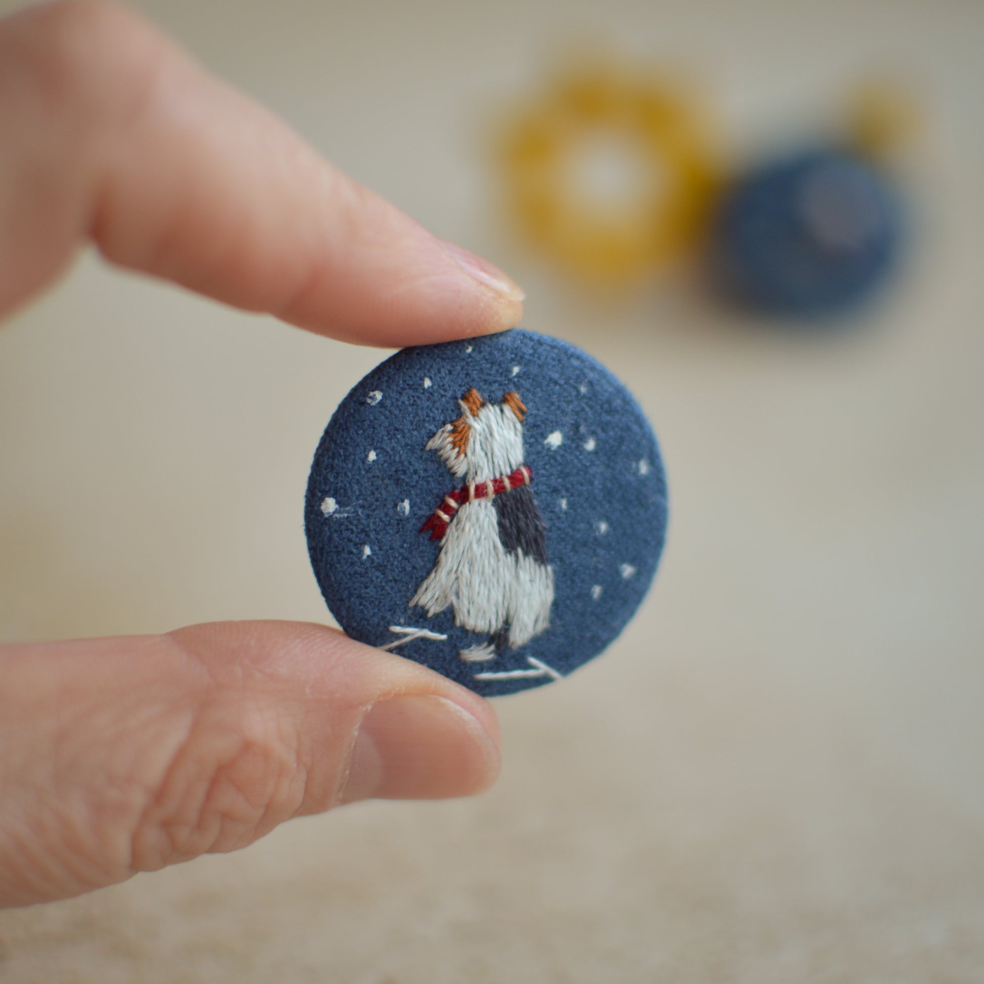 This handmade embroidered badge features a wintery Fox Terrier on faux suede, detailed with tiny stitches and delicate snowflakes. Thoughtfully crafted in a small 3 cm size, it adds a warm holiday touch to any outfit.