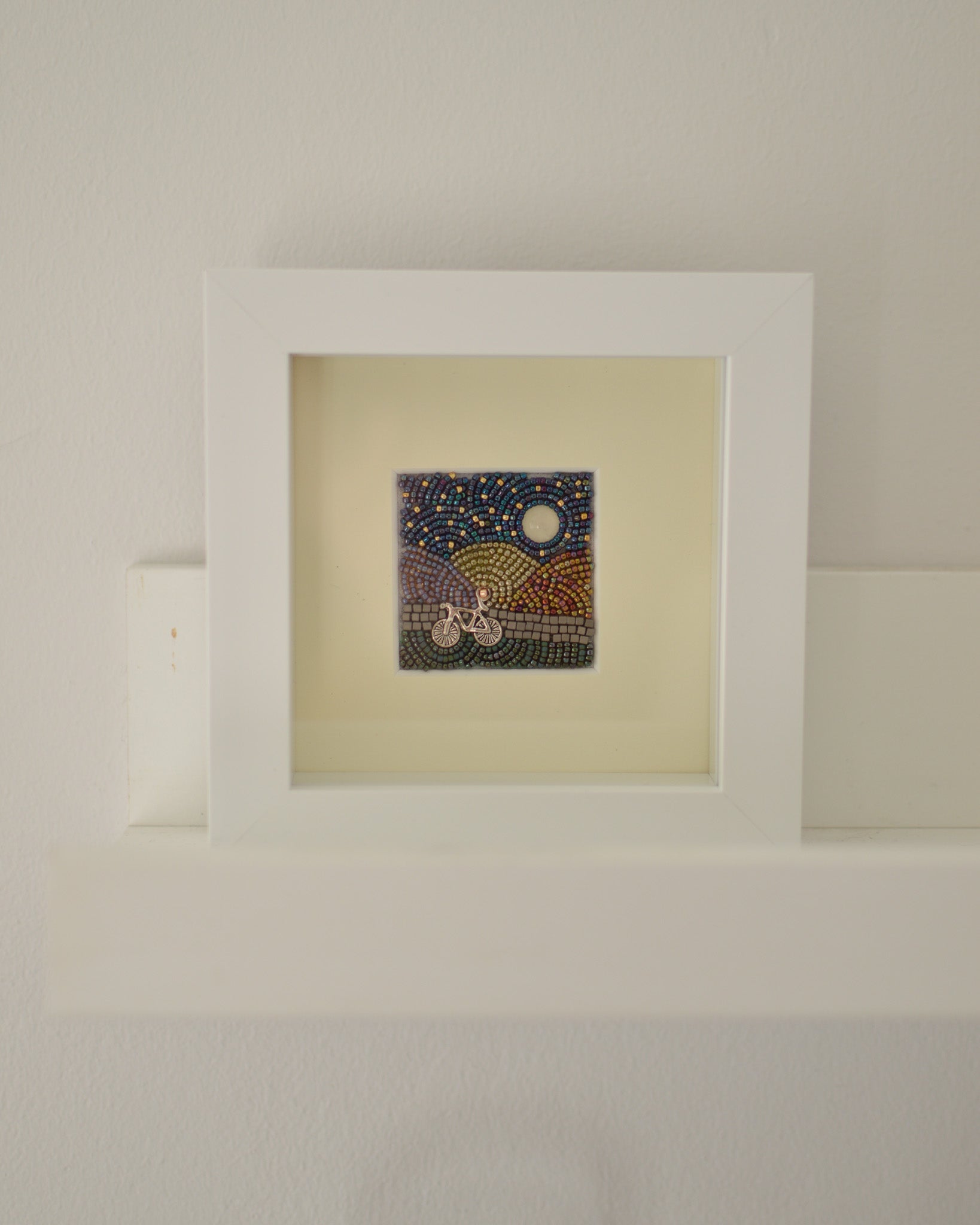 This is a unique bead embroidered picture with Yorkshire landscape by night (complete with drystone wall :).
