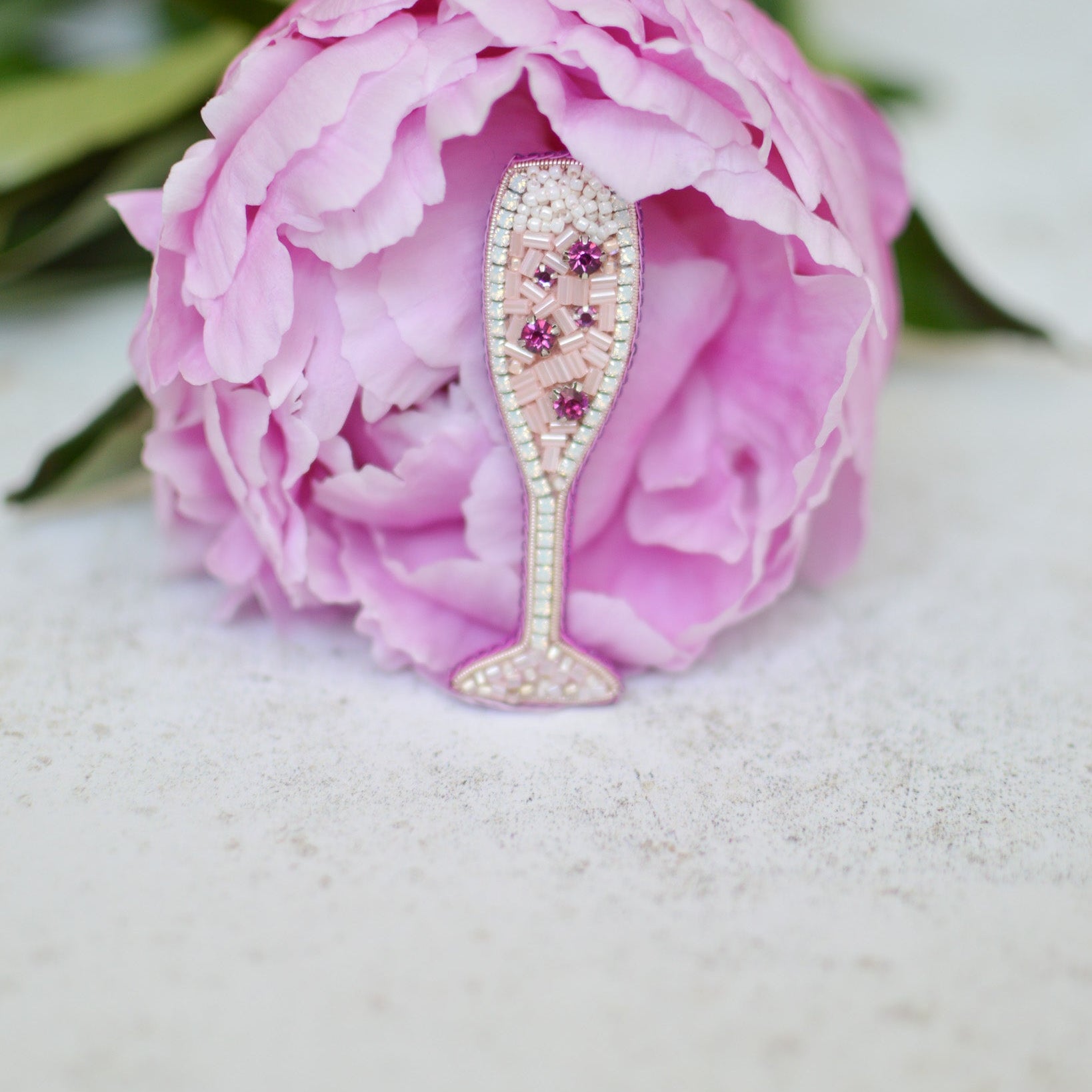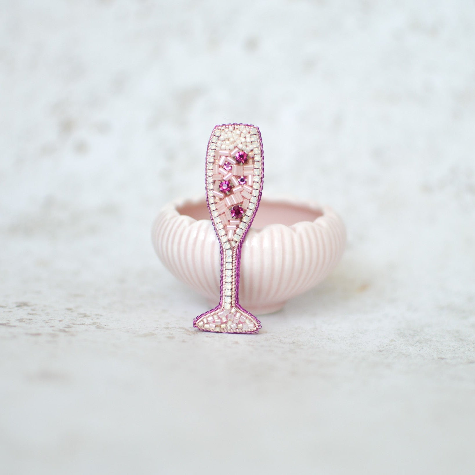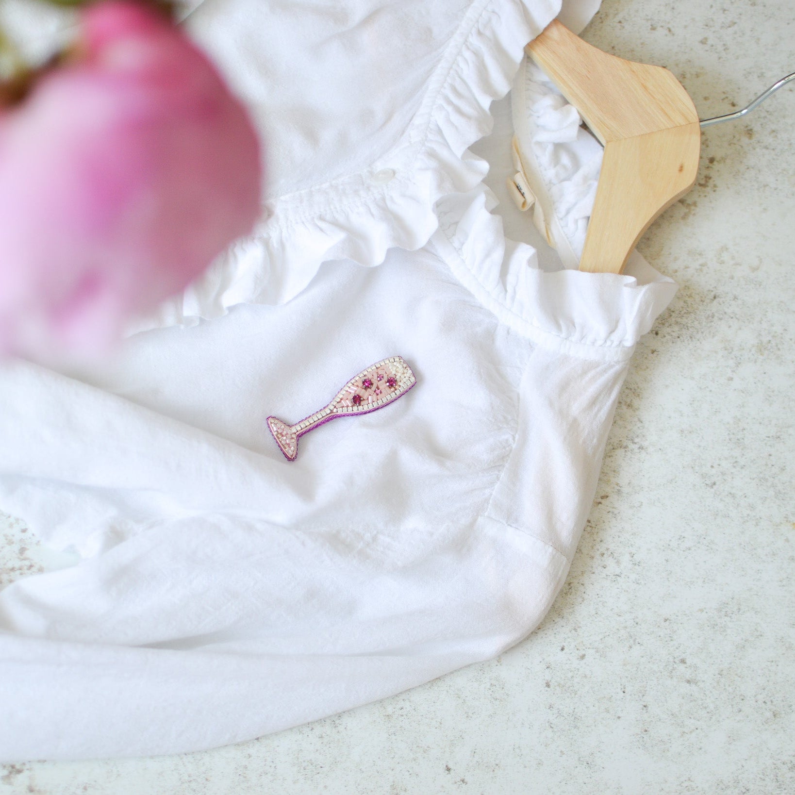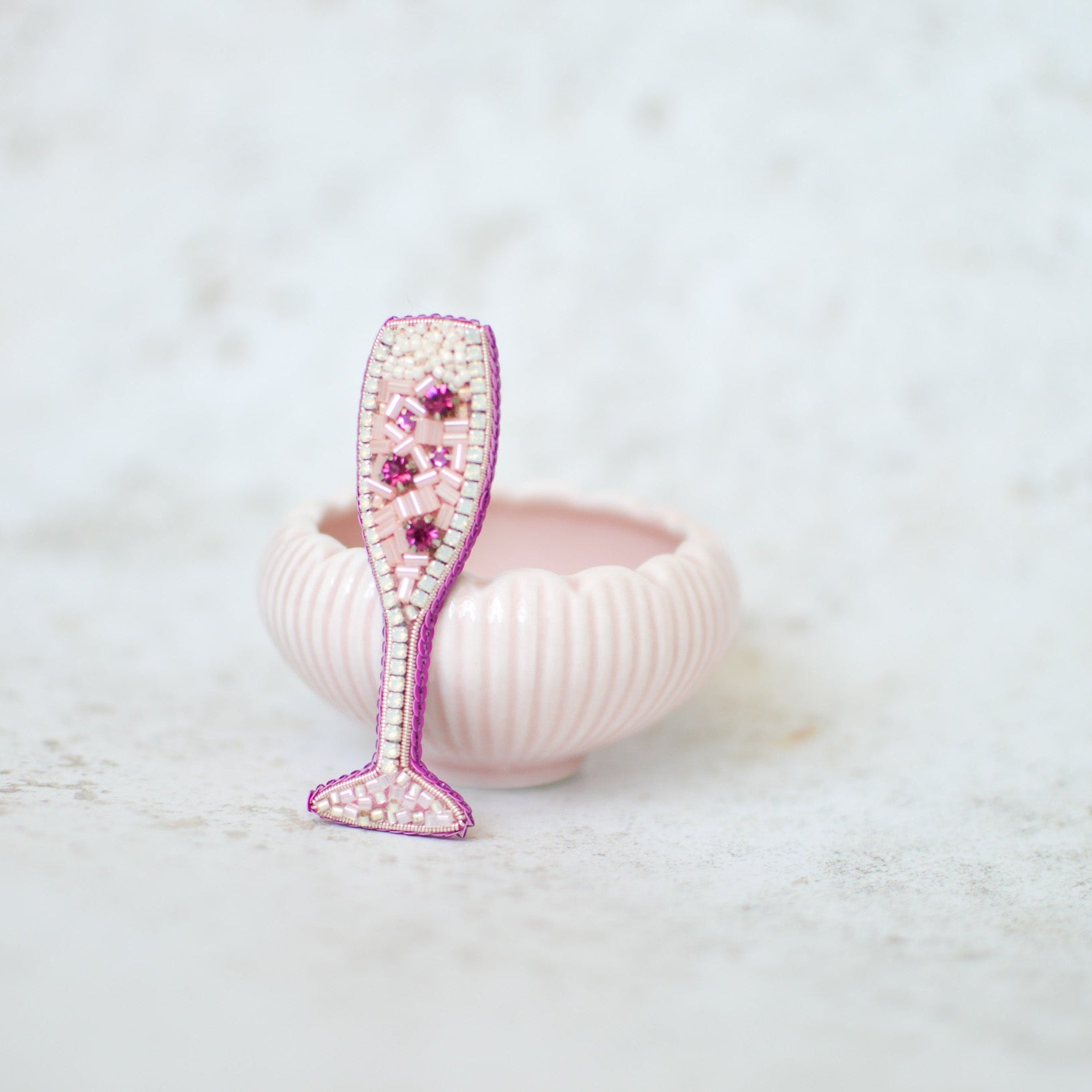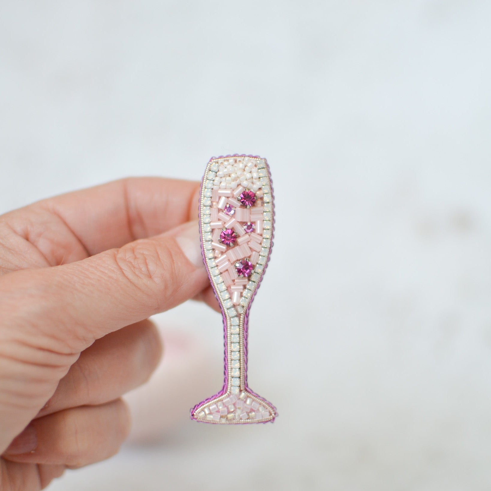 Pink Wine Glass Embroidered Brooch, Prosecco Glass Brooch